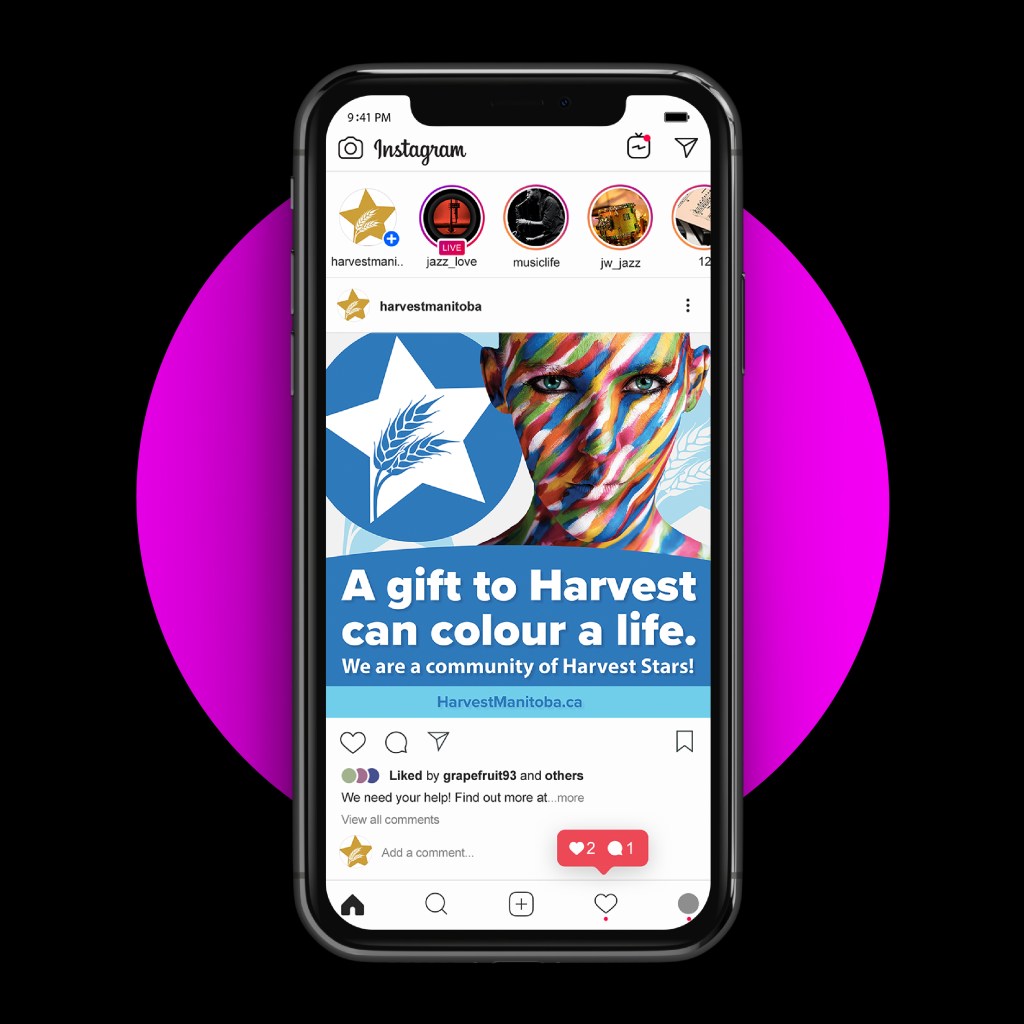 A series of social media and sponsored ads promoting donations to Harvest Manitoba.