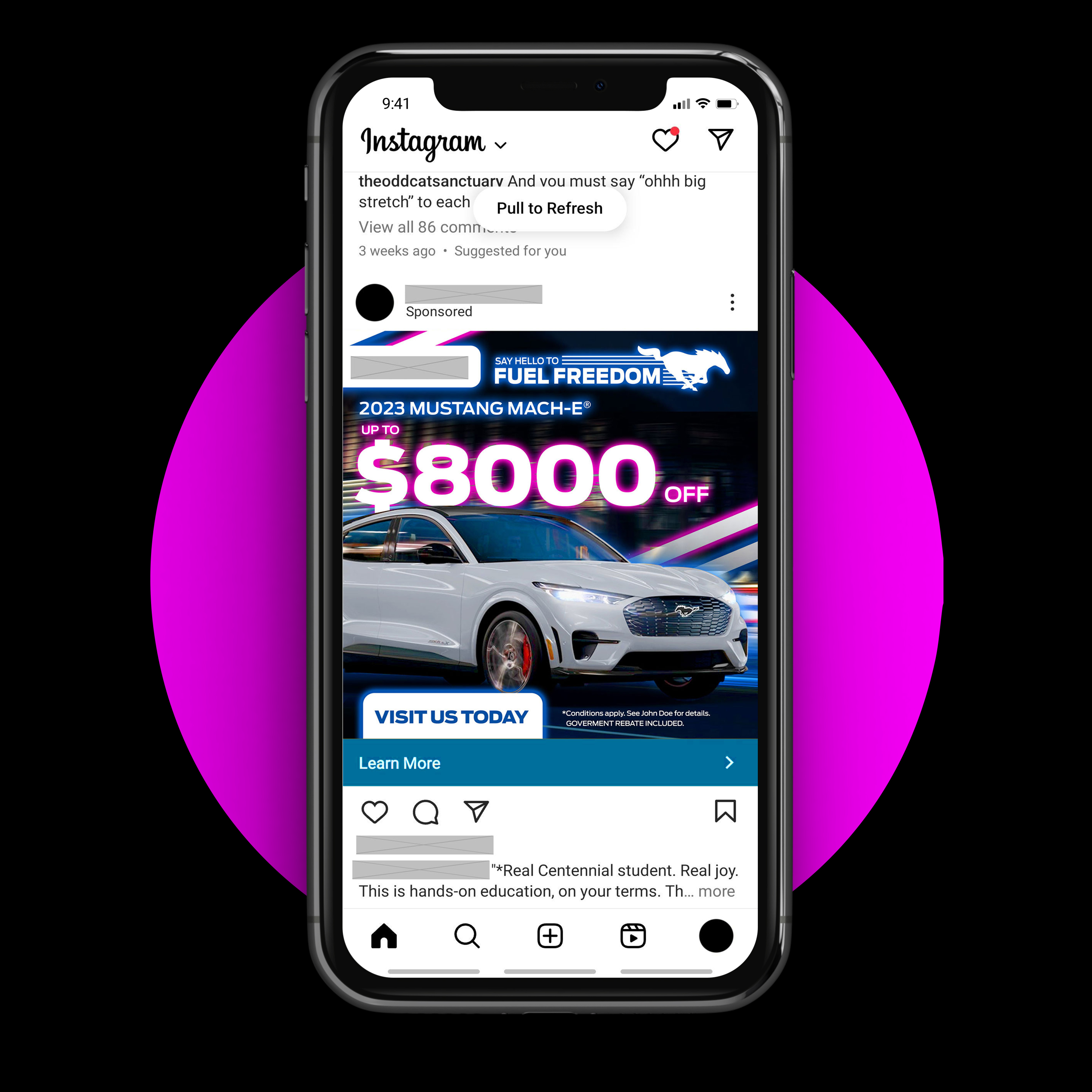 A digital ad campaign promoting the sale price of a Ford 2023 Mach-E.
