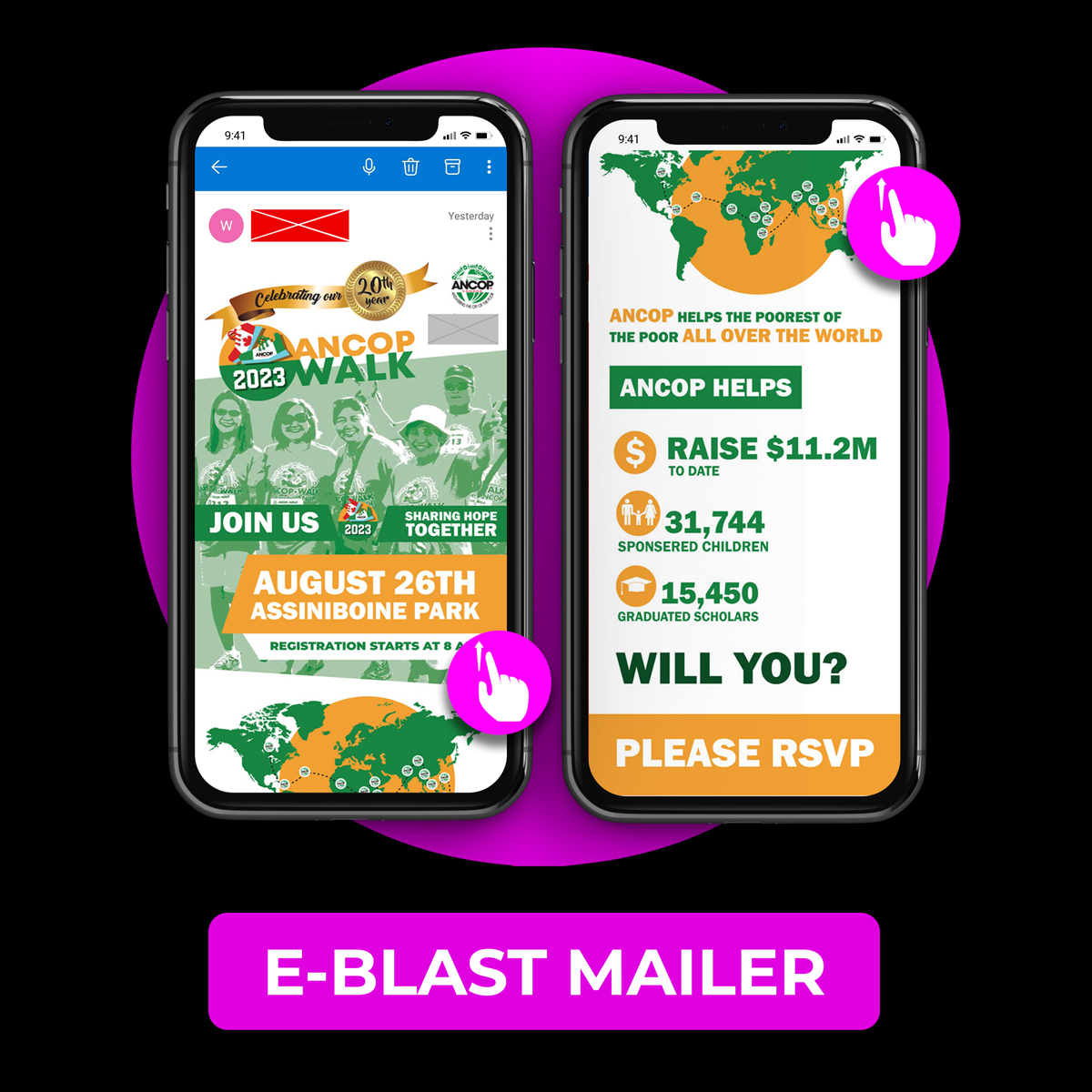 This ad campaign was created with Ancop Canada to promote the highly anticipated 2023 Ancop Charity Walk. This dynamic ad goes beyond simply showcasing the event’s date and location; it also educates viewers about Ancop’s significant global contributions, fostering increased registrations. Look out for these impactful ads across various platforms, including website sliders, billboards, flyers, posters, E-blast mailers, and social media channels.