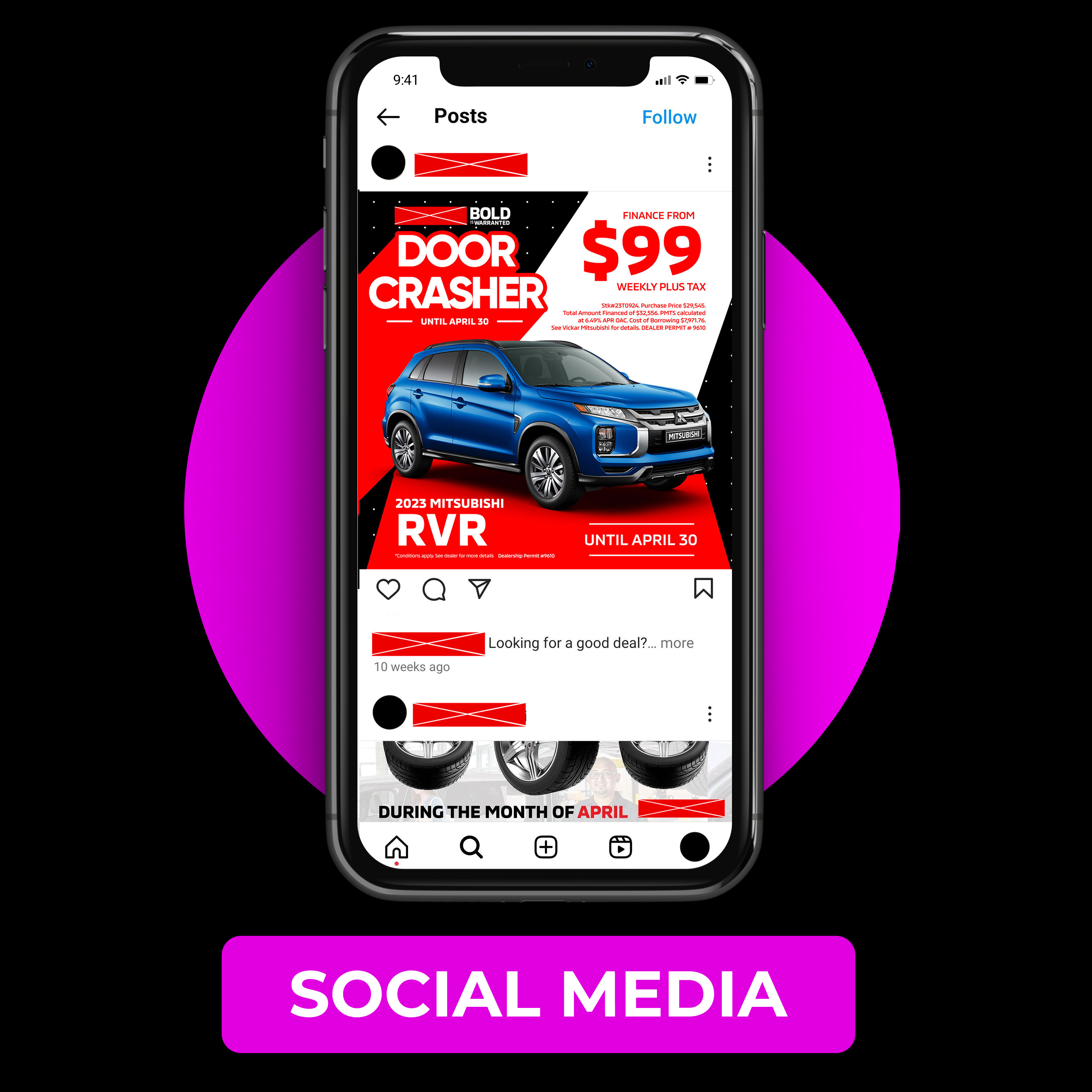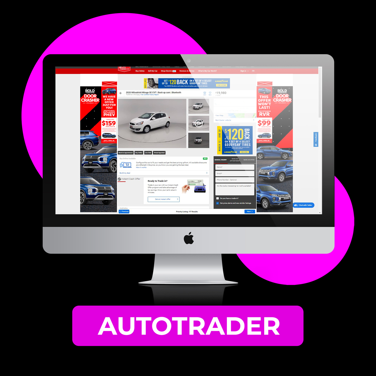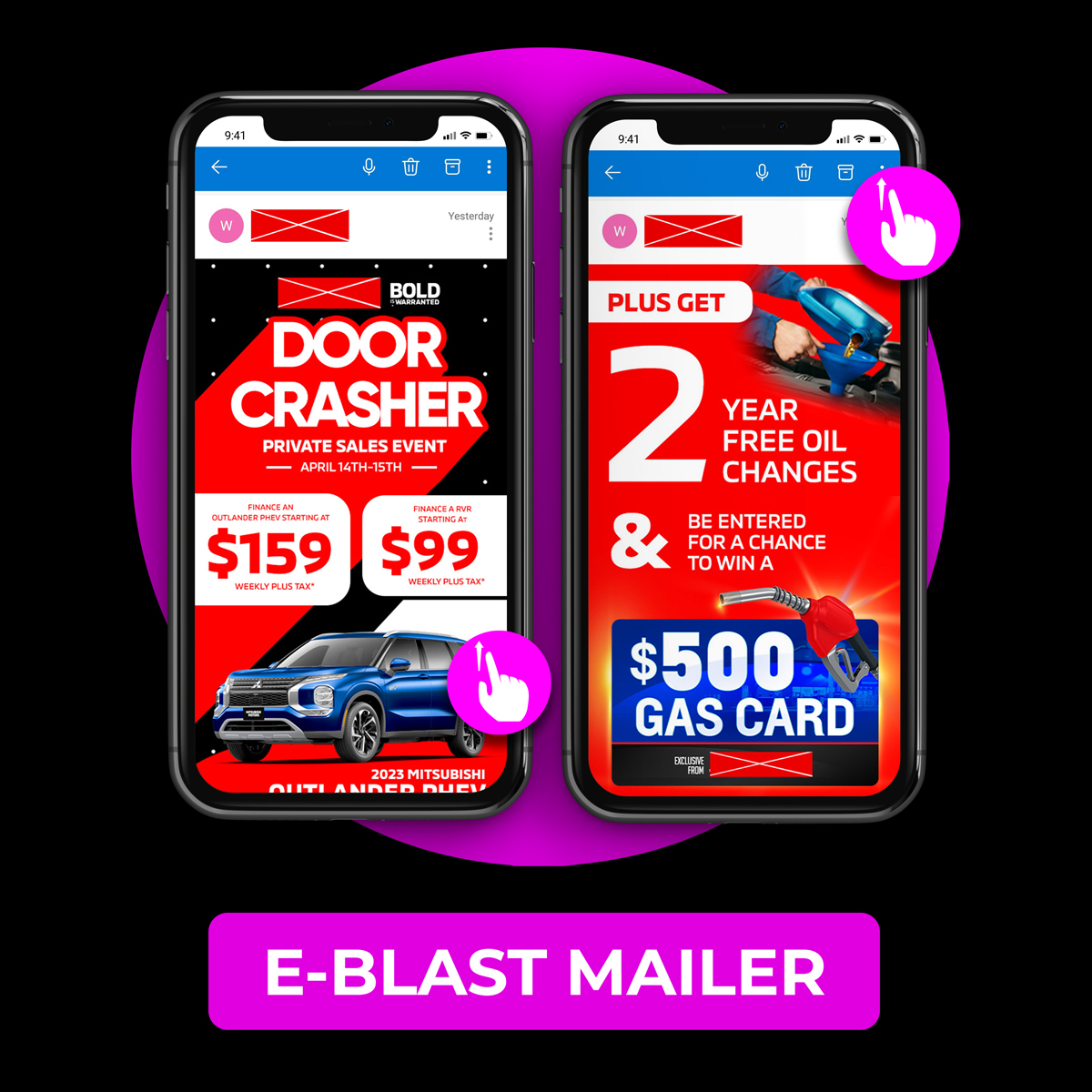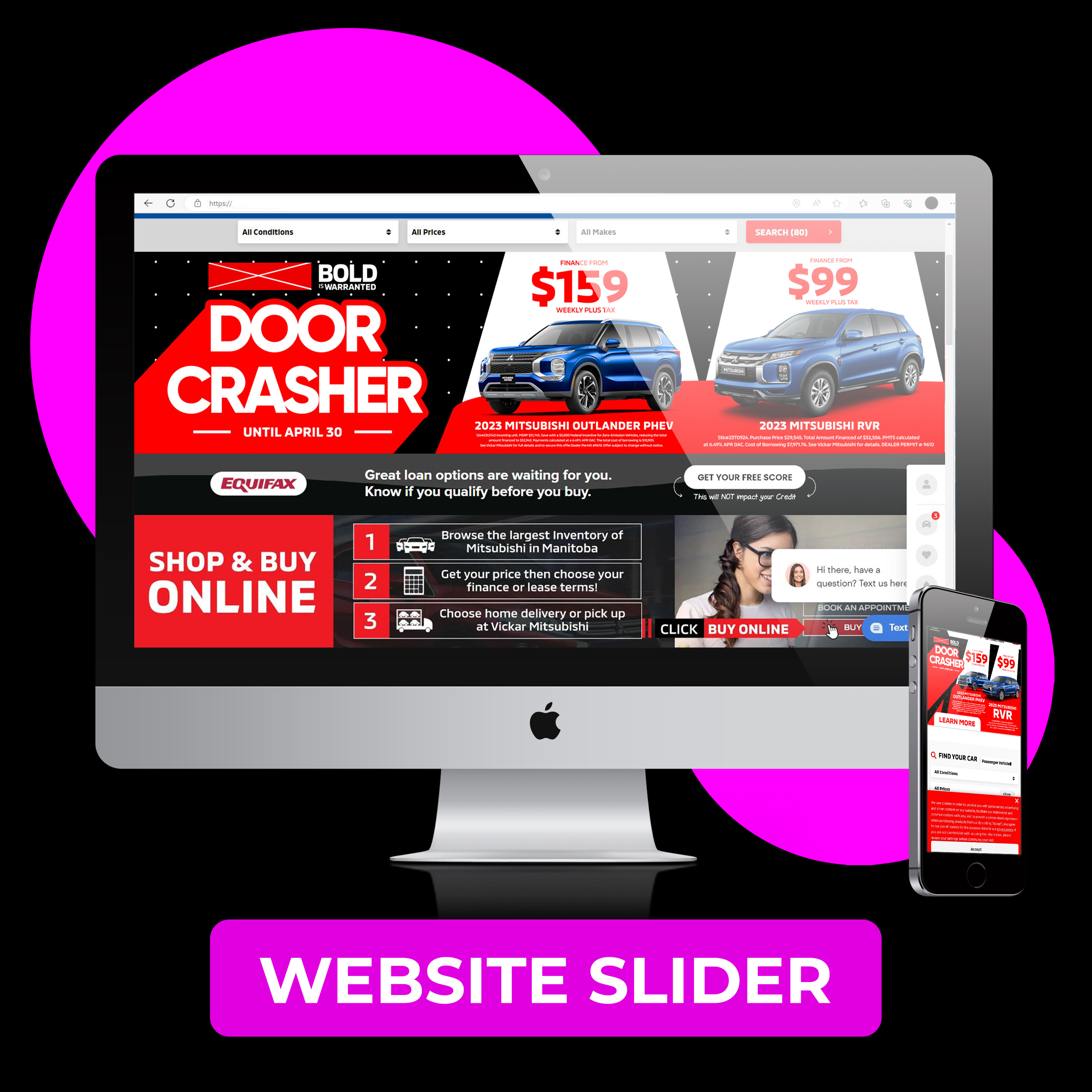 This ad campaign showcases the sales prices of certain Mitsubishi models at a local dealership. Intending to stand out from other Mitsubishi dealerships offering comparable prices, the campaign boasts a visually striking design that demands attention. These captivating ads have been strategically placed across various platforms, including website sliders, billboards, auto trader ads, E-blast mailers, sponsored website ads, and social media promotions.