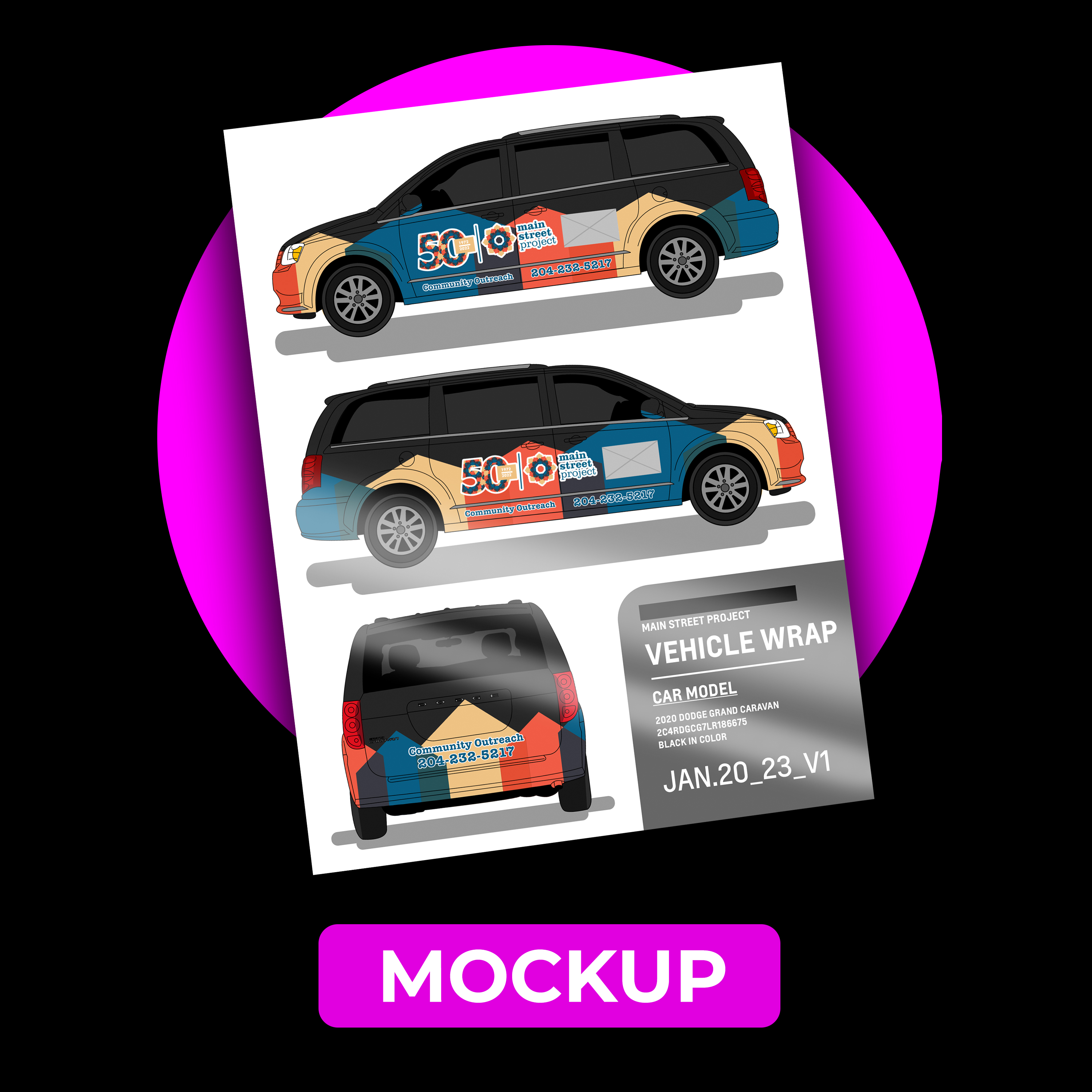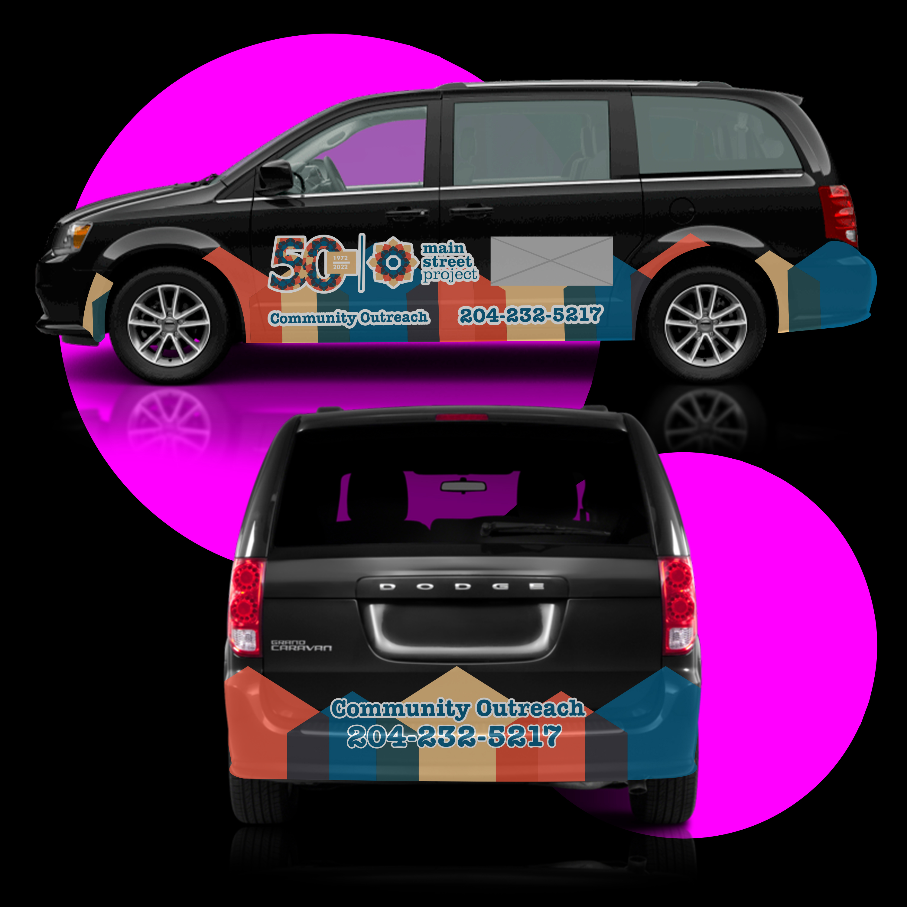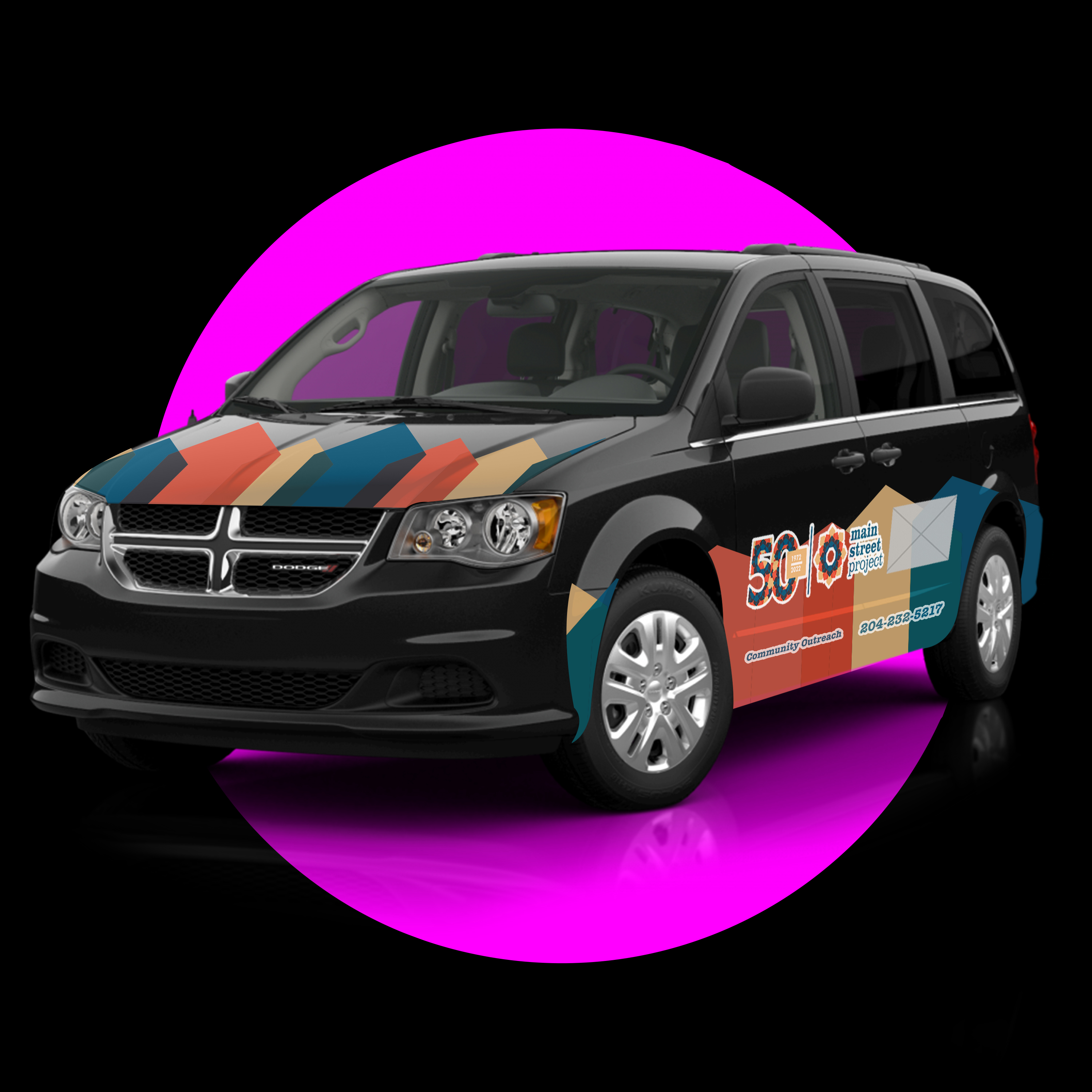 This vehicle wrap was designed and generously donated to Winnipeg’s Main Street Project. This captivating wrap was created in Illustrator, utilizing a carefully selected palette of colors and shapes that align with Main Street Project’s brand identity.