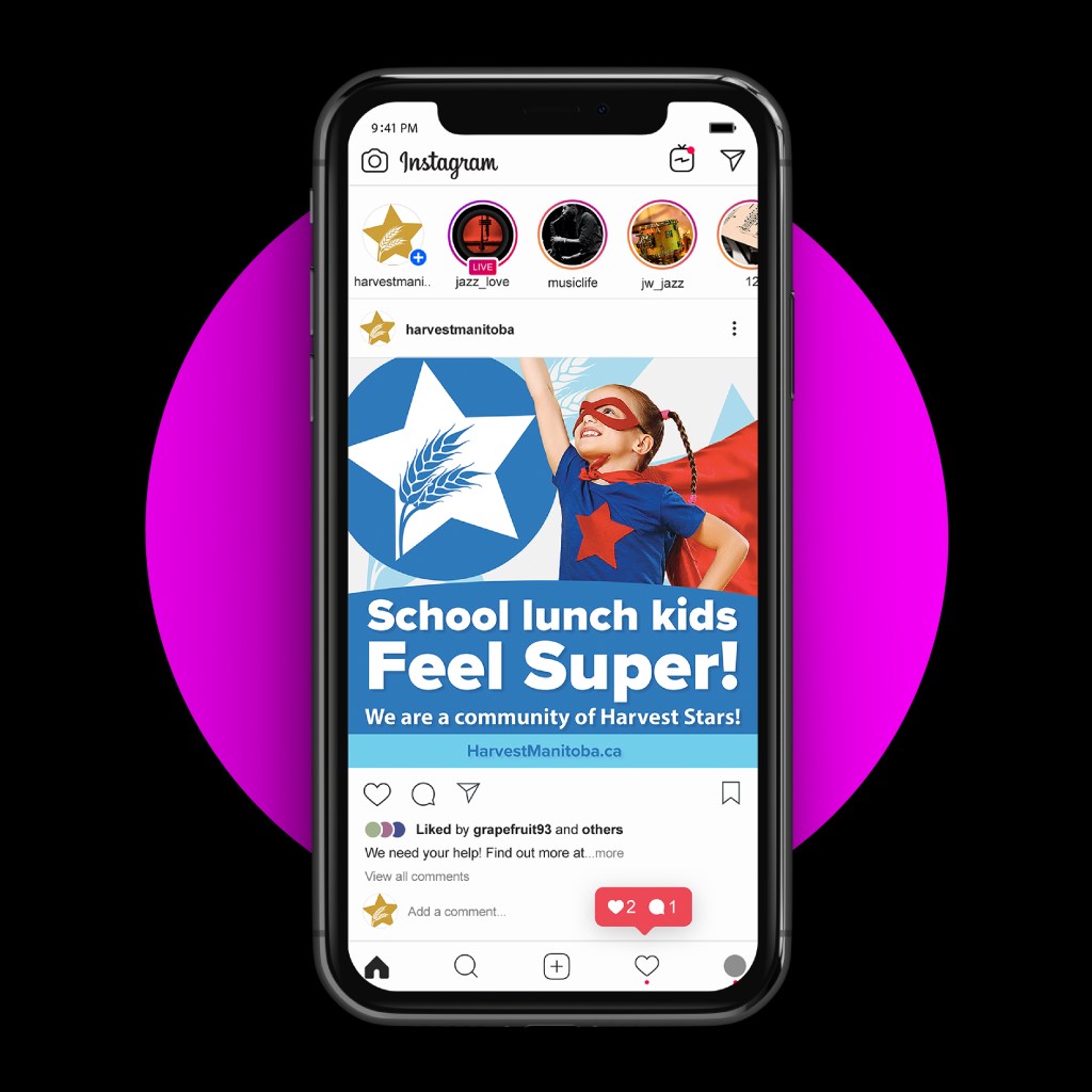A series of social media and sponsored ads promoting donations to Harvest Manitoba.